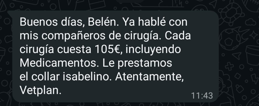 Me he puesto en contacto con Vera, una de las veterinarias de la clínica a la que llevo l@s gatit@s, que está en Miranda do Douro, a 15 kilómetros de Luelmo y que pertenece a Portugal, le he planteado que quiero esterilizar a 5 gatas y que cuanto me cobraría por las cinco y me ha respondido lo siguiente: